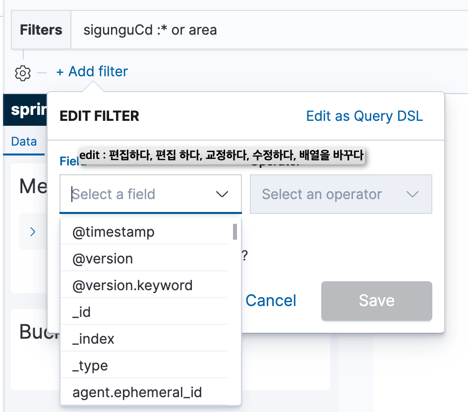 UI 상에서 사용하는 필터는 아래와 같이 Add filter 를 누르면, 선택 가능한 필드 및 연산자를 선택할 수 있게 해준다.