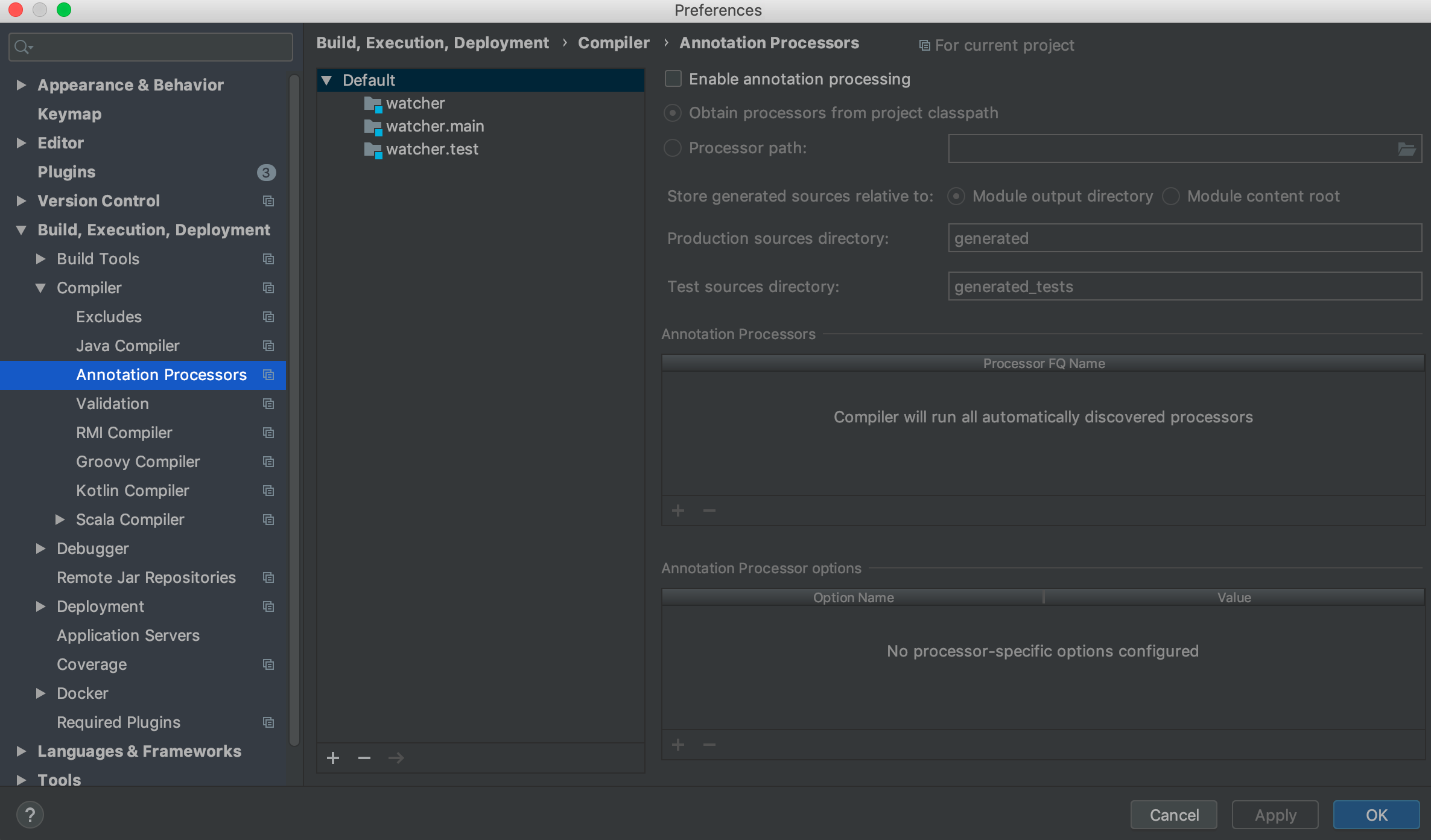 Build, Excution, Deployment > Compiler > Annotation Processors 에서, Enable annotation processing 을 체크 해주면 된다.