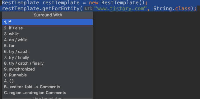 둘러쌀 코드 영역을 지정하고, 어떤 코드로 감쌀지 선택하면 됩니다.