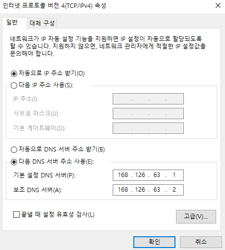 5. DNS 서버를 "다음 DNS 서버 주소 사용" 을 선택하고, 아래 DNS 정보를 입력하고 "확인"을 누릅니다.