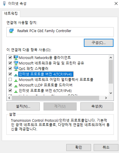 4. 인터넷 프로토콜 버전 4(TCP/IPv4) 의 속성으로 이동