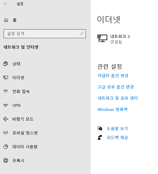 2. 윈도우 설정 > 네트워크 및 인터넷 > 이더넷 에서 어댑터 옵션 변경 으로 이동합니다.