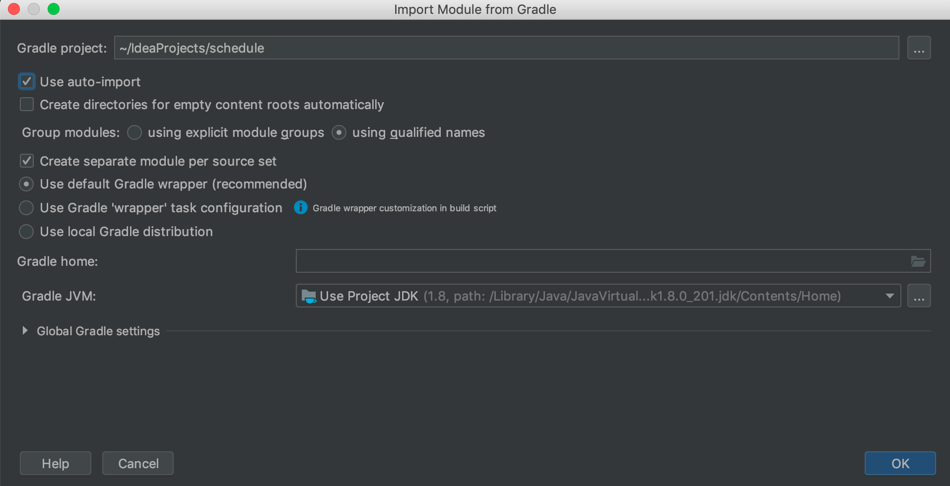 6. Use auto-import와 Use default Gradle wrapper를 선택하고 OK를 누르면 gradle project가 생성되고 필요한 dependency를 gradle에 정의된 대로 받으면 빌드가 가능해집니다.