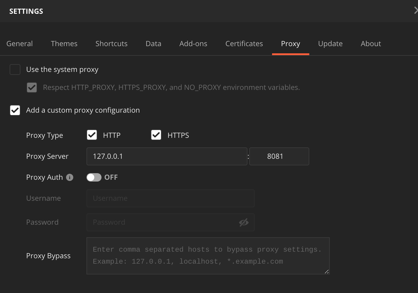 Postman에서 proxy를 사용하기 위해서는, Settings > Proxy 탭에서, "Use the system proxy" 를 체크해서 사용하거나, "Add a custom proxy configuration" 을 사용하면 됩니다.