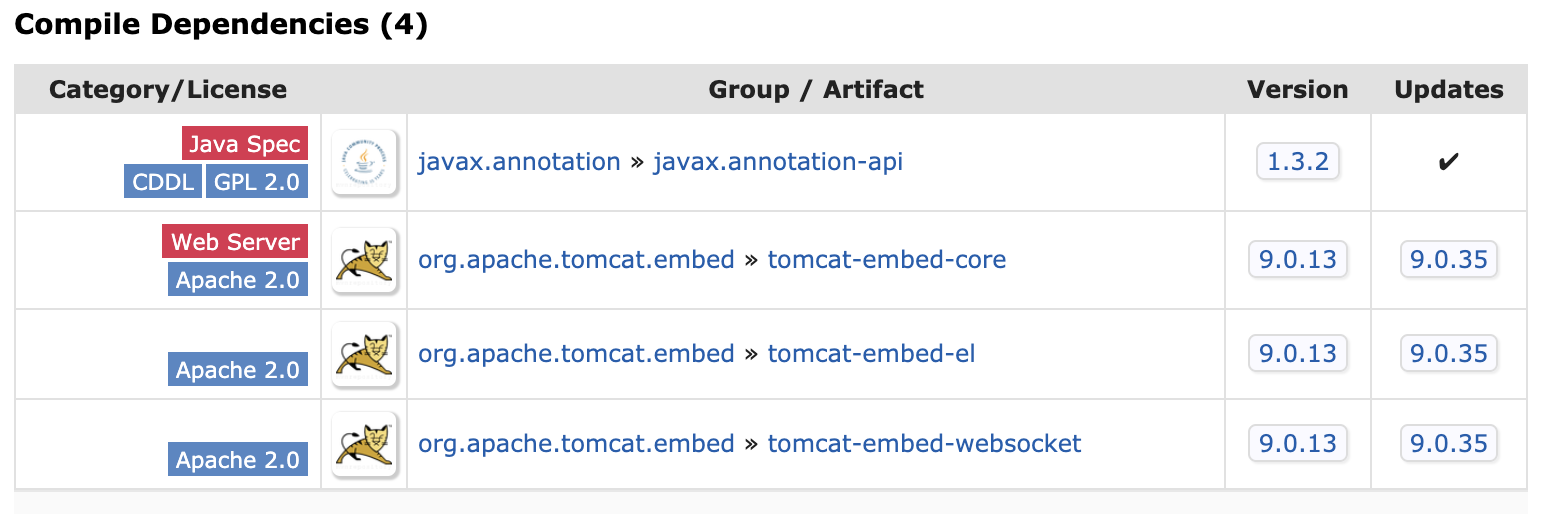 그러면 MVNRepositry에 가서 spring-boot-starter-tomcat 2.1.1 버전의 페이지를 들어가면, Compile Dependencies 에 사용하는 웹서버의 버전이 나온다.