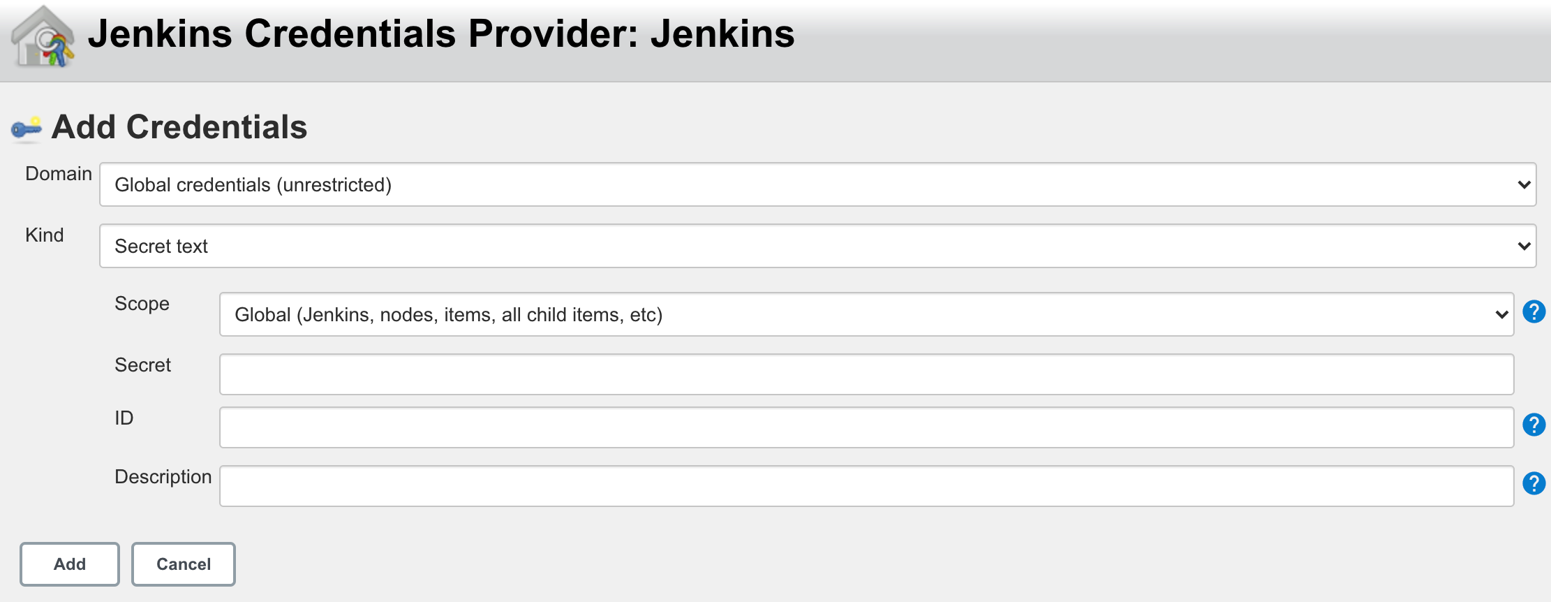그리고 Credential 에 Add 버튼을 눌러, Kind에는 Secret text를 선택하고, ID에는 credential 명으로 쓸 아무 unique한 이름을 입력하고, Secret에는 Integration Token Credential ID 값을 입력하고 Add 버튼을 눌러 Credentials을 추가해줍니다.