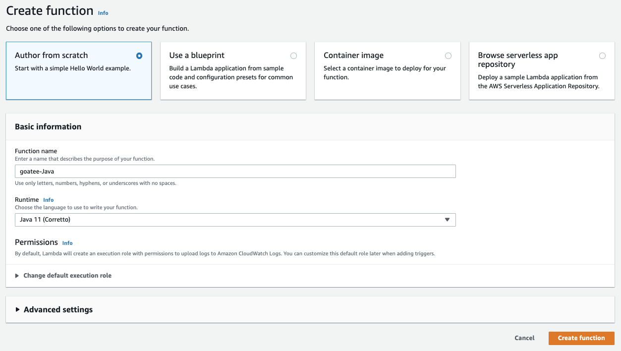 Function name을 작성, Runtime에 Java를 선택, Permissions에 적절한 role을 선택해 줍니다.