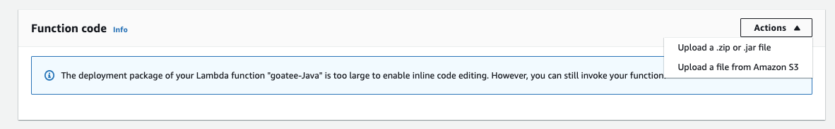 콘솔에 Function code > Actions > Upload a .zip or .jar file 을 선택하여 blank-java.zip 파일을 업로드 해줍니다.