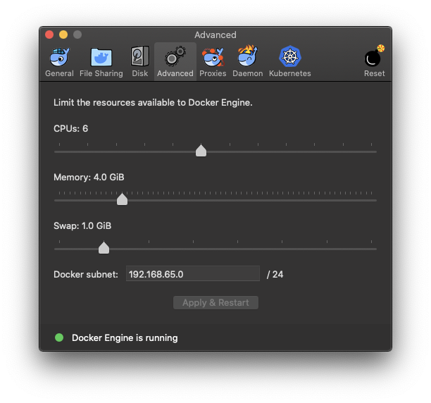 그때는, 도커의 Preference 메뉴에서 Advanced에 있는 Memory 값을 조정해준 뒤에