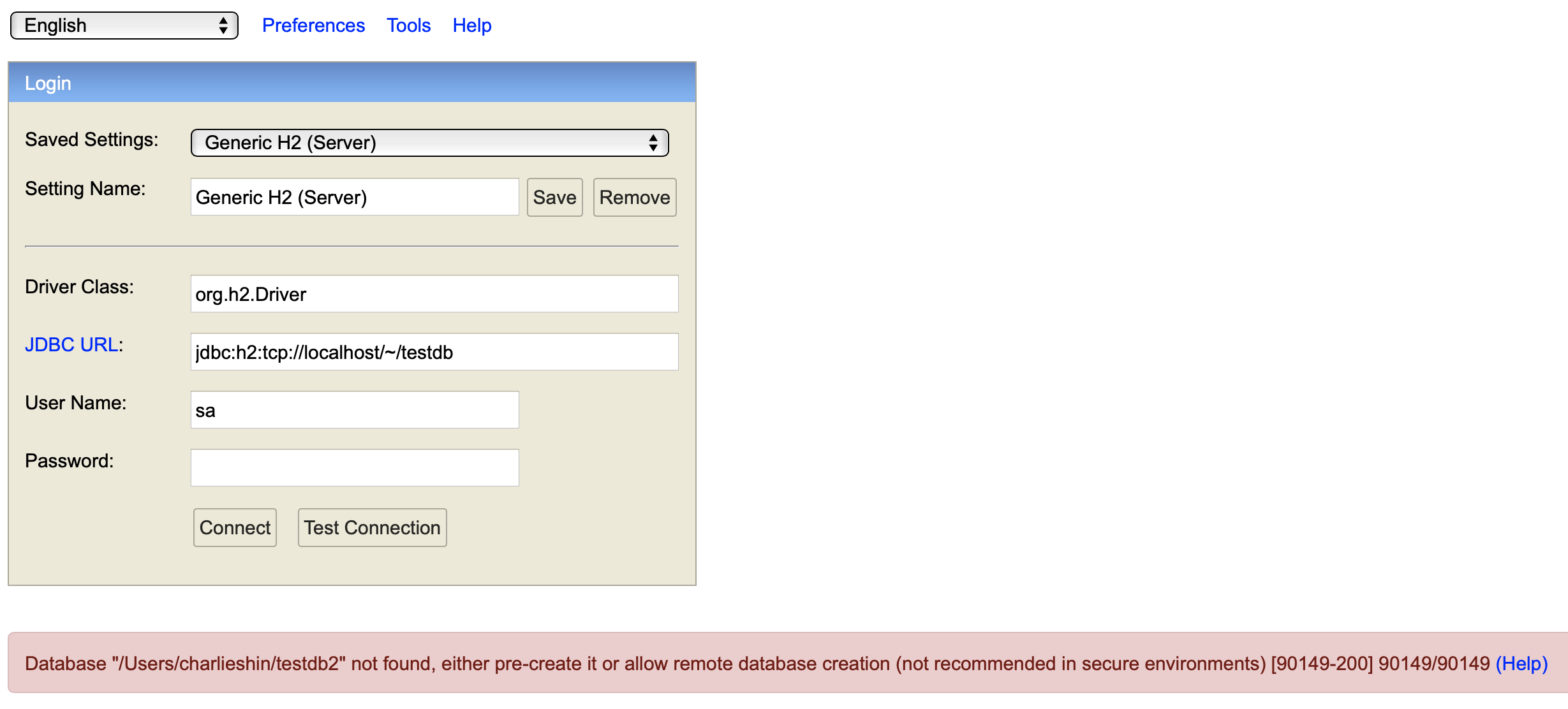 org.h2.jdbc.JdbcSQLNonTransientConnectionException: Database "/Users/xxxx/testdb" not found, either pre-create it or allow remote database creation (not recommended in secure environments) [90149-200]