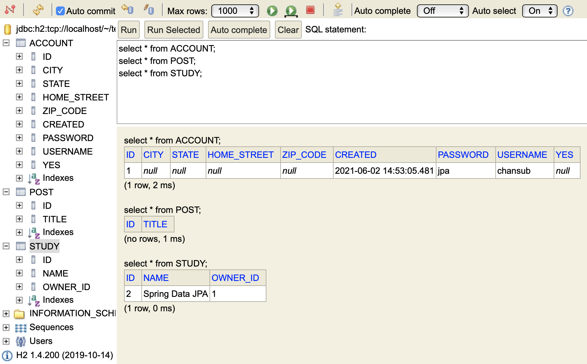 그리고 H2 콘솔에서 데이터 베이스를 조회해보면 데이터가 잘 들어갔는지 확인이 가능합니다.