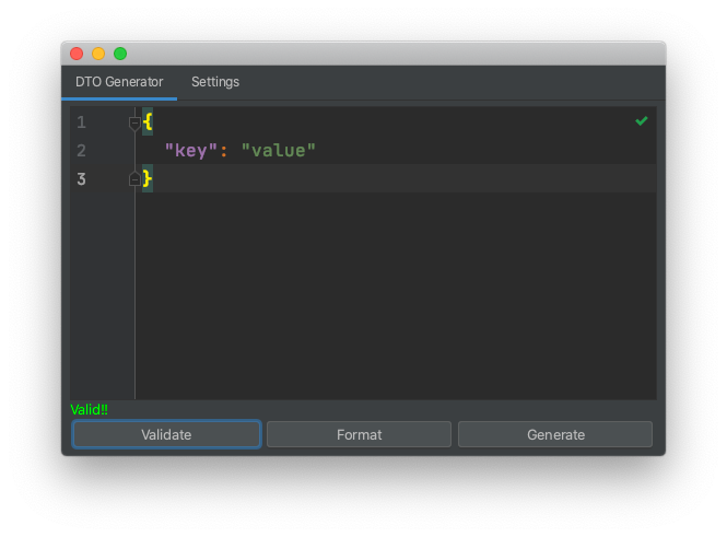 변환할 json 값을 입력하고, Validate를 눌러 유효성 확인을 합니다.