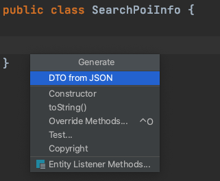 그리고 Code > Generate 에서 DTO from JSON을 선택합니다.