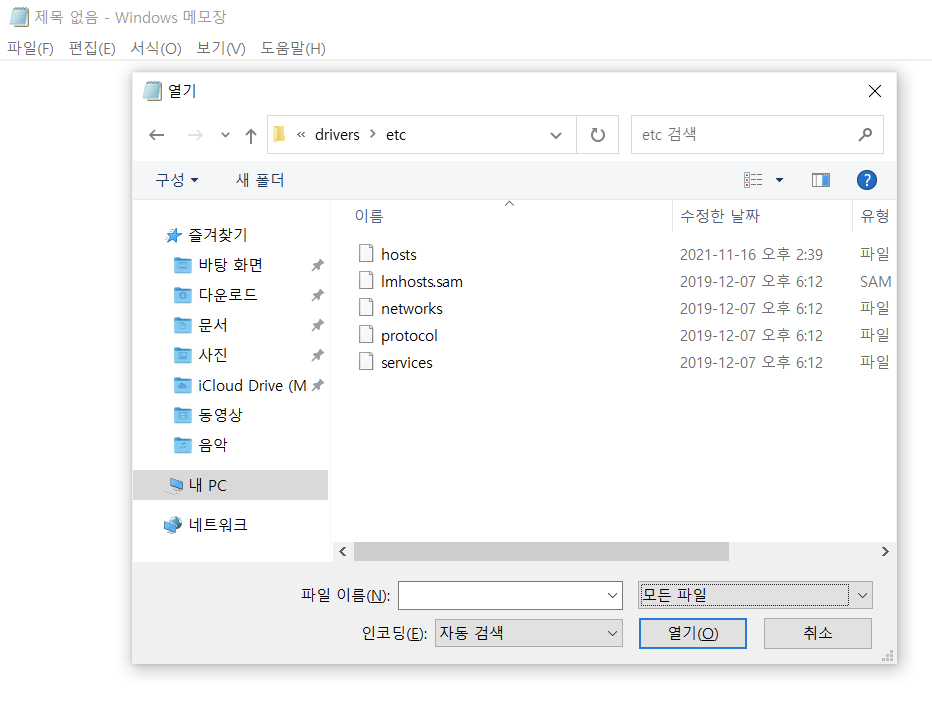 C:\Windows\System32\drivers\etc에 있는 hosts 파일을 엽니다.