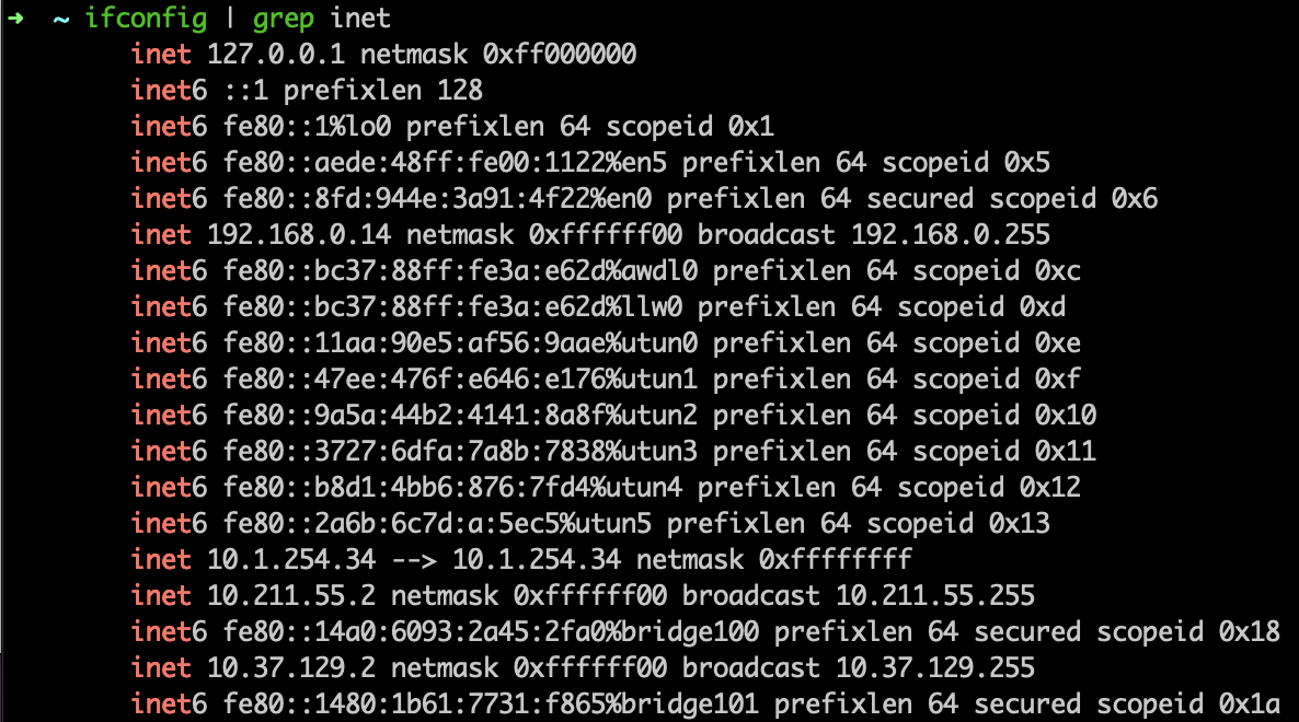 MAC 터미널에서 ifconfig 명령으로 IP 주소를 확인합니다.