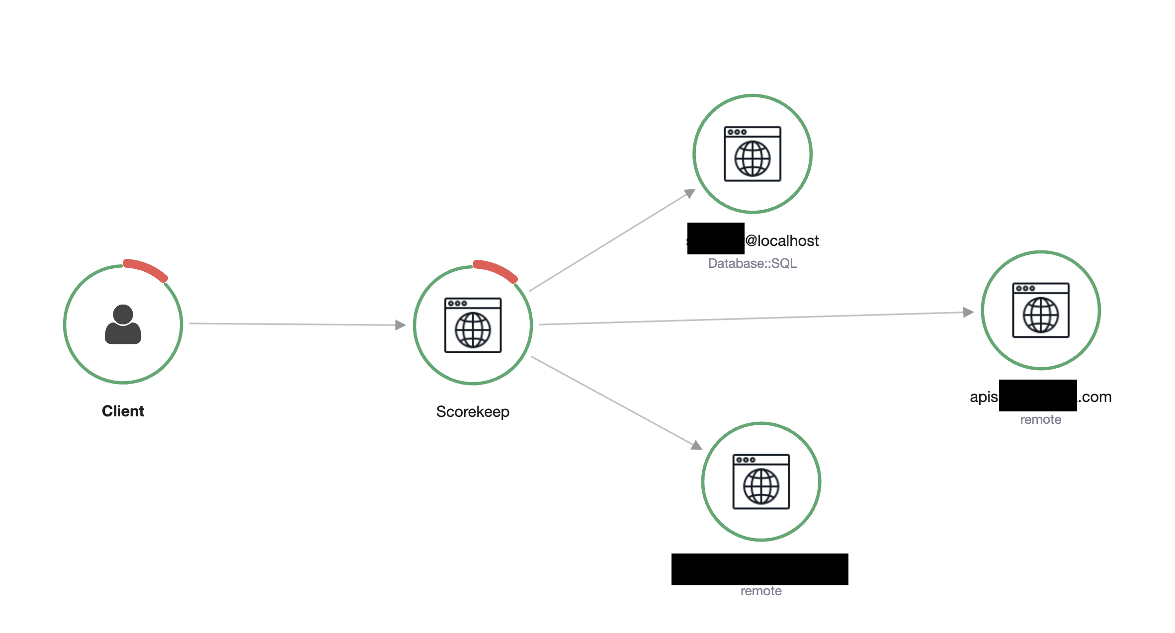 Scorekeep이라고 되어 있는 부분이 애플리케이션이며, JDBC를 통한 MySQL로 쿼리 호출하는 부분은 Database::SQL로 기타 외부 서비스로 HTTP 호출하는 부분은 remote로 표현이 됩니다.
