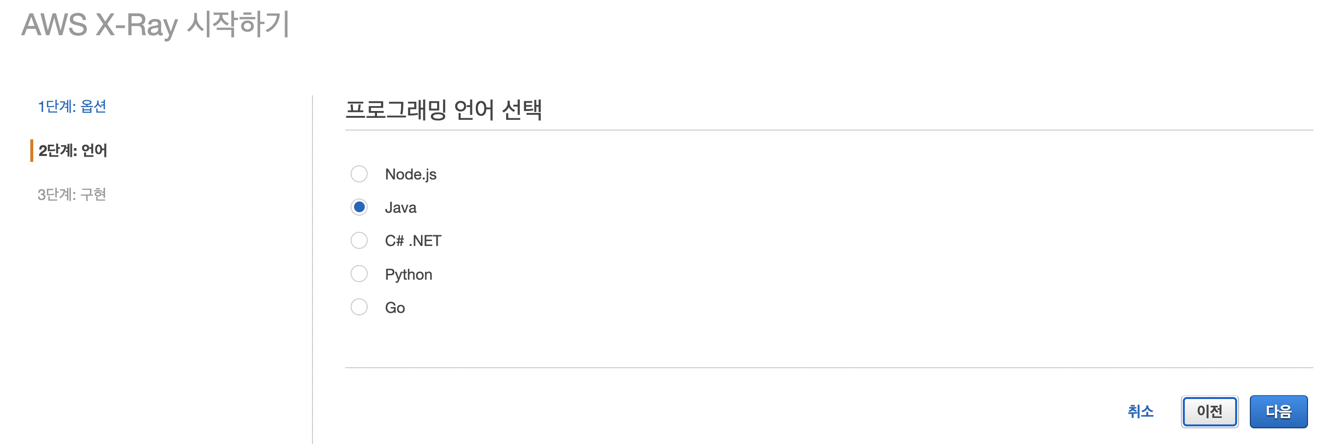 먼저 AWS 웹사이트에 X-Ray 콘솔로 들어가 아래와 같이 선택을 하여 다음을 눌러줍니다.