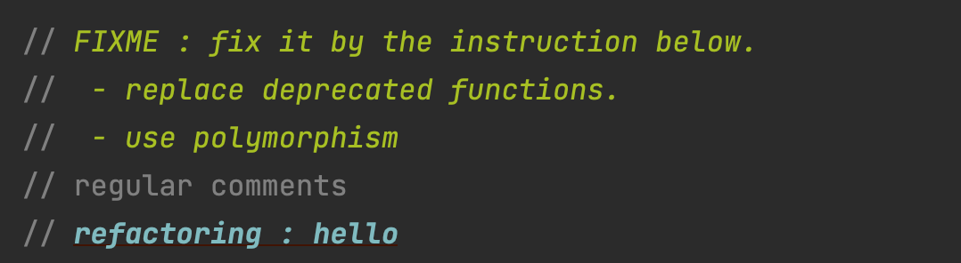 아래 코드를 보면 refactoring 주석에 파란색, bold, Italic, Underscored 효과가 적용되어 있습니다.