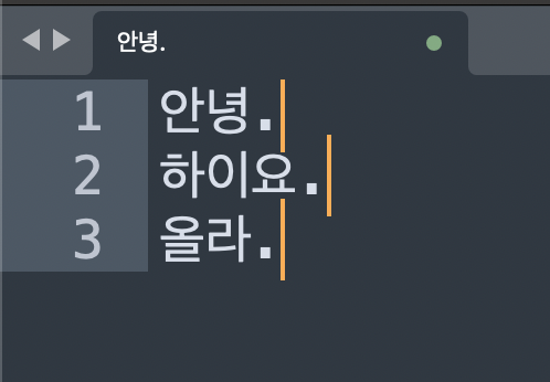 마우스를 눌러 아래 또는 아래로 드래그를 하면 아래와 같이 여러 줄에 같은 위치에 커서가 위치하게 됩니다.