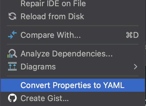 properties 파일에 마우스 오른쪽을 클릭하면 "Convert Properties to YAML" 메뉴가 나오는데 이걸 선택합니다.