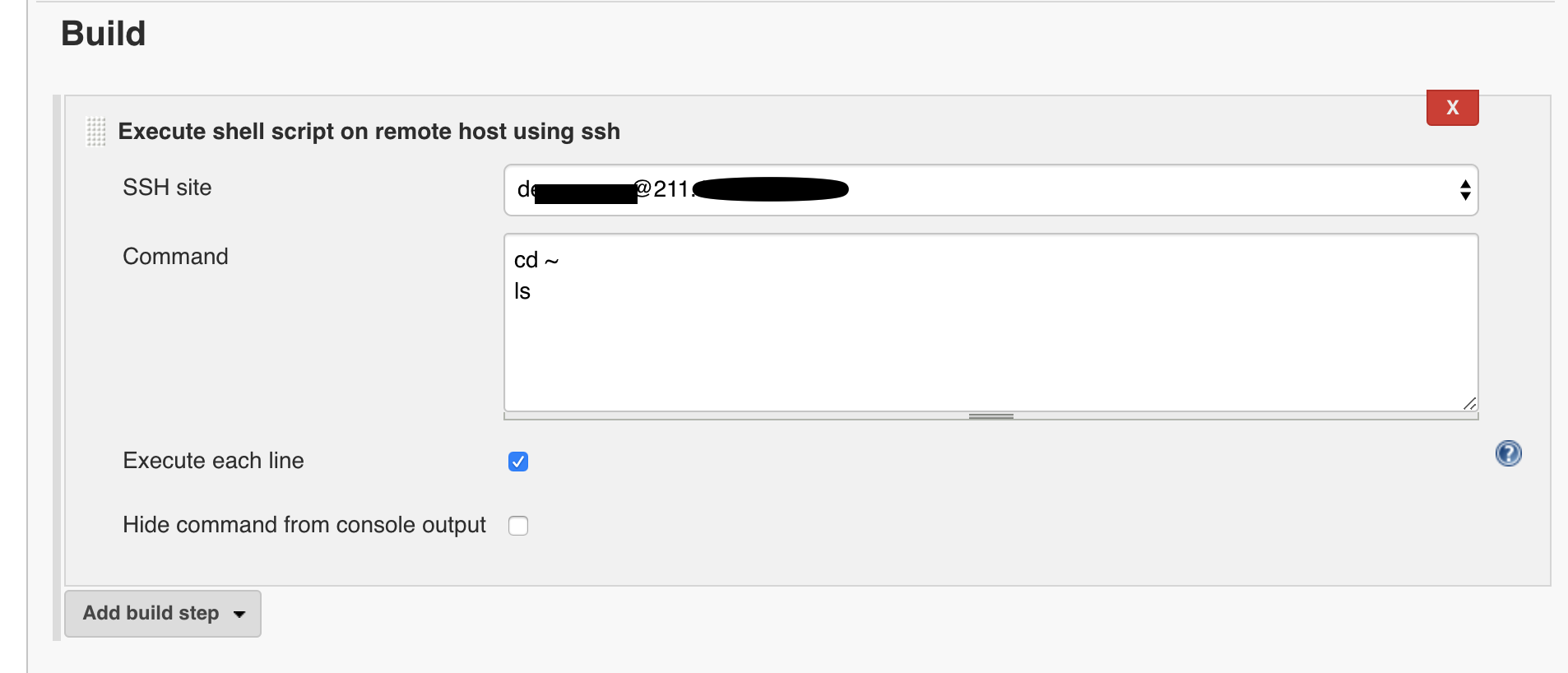이 때 shell 명령으로 진행을 하게 될 경우 Build 항목에 Execute shell script on remote host using ssh 라는 모듈을 사용하게 된다.