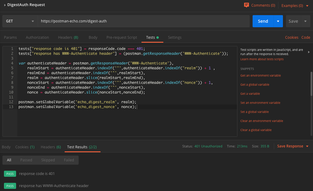 요청의 Tests 탭에서 테스트 스크립트 작성이 가능하고, JavaSciprt 로 작성을 하면 된다.
