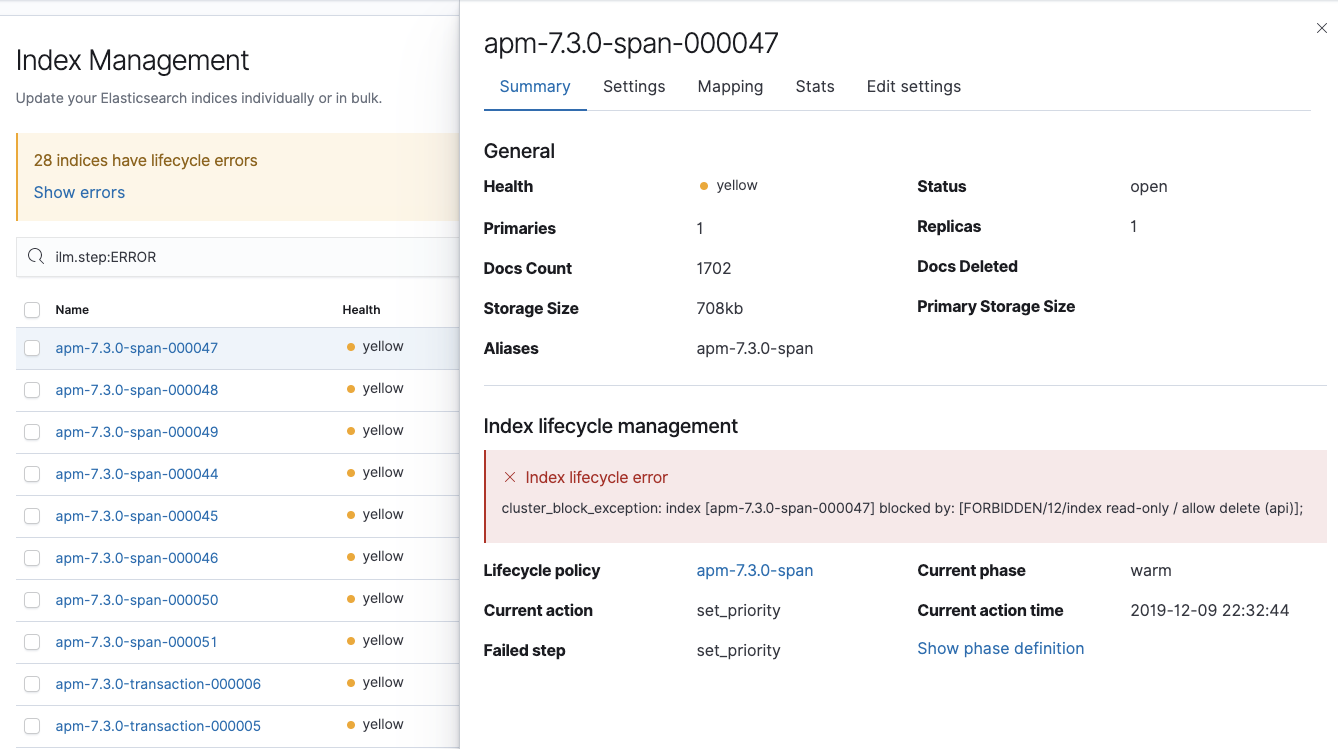 apm 관련 에러 index 에서 ES 의 index가 block이 됐다거나 read-only, allow delete (api) 의 메시지를 보게 되면 아래와 같이...